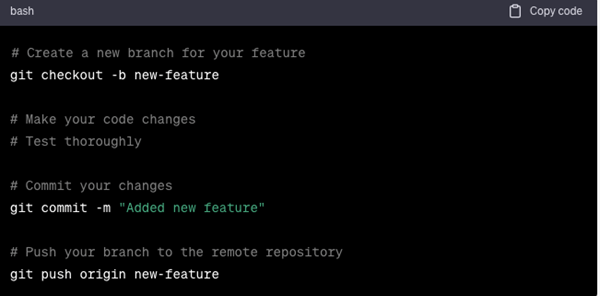 Version control is essential for keeping track of changes to your app.. Using a version control system like Git ensures you can roll back changes if needed. Here is a basic workflow for adding new features: